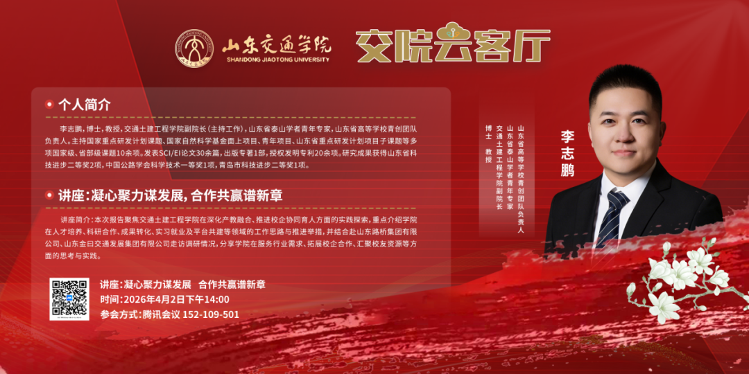 为庆祝山东交通学院建校70周年,传承育人薪火,献礼母校华诞,凝聚校友力量,学校开设交院“云客厅”讲座,以名师讲堂联结校友情谊,共享行业新知,携手共赴交通强国新征程。